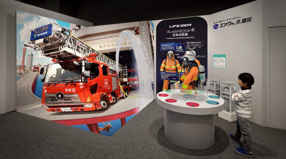 当社の企業展示ブースでは、消防士が火災現場で使用する呼吸器をテーマに、その仕組みや役割を楽しく学べる展示を展開しており、消火活動に関するクイズを通じて防災や消防の知識を学べるほか、トリックアートによる消防車との写真撮影スポットを設置し、体験を通じて消防や科学への理解を深めていただける内容となっています。